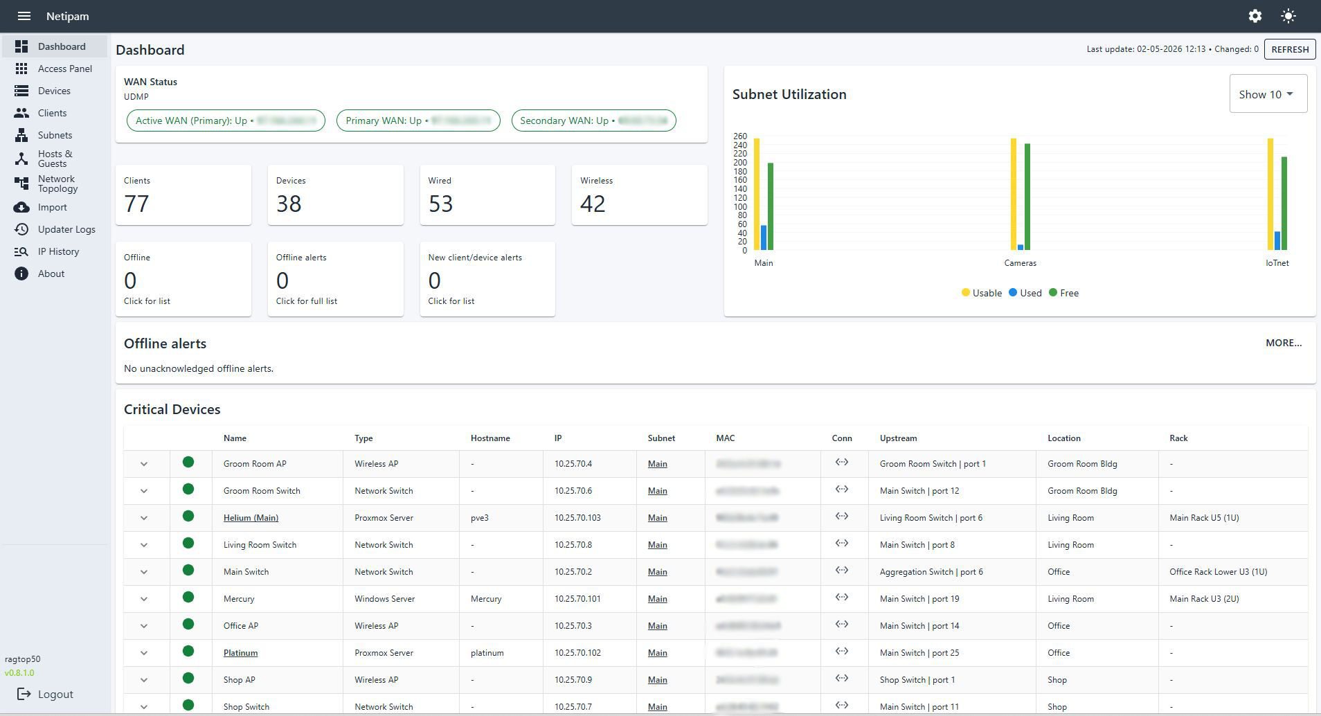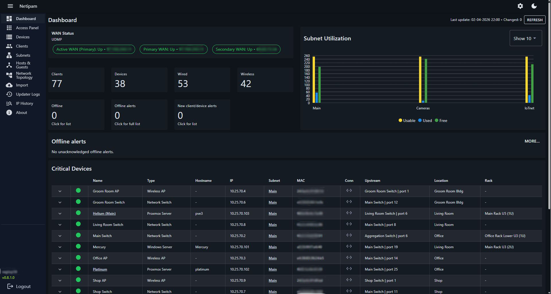 Netipam is designed for people who want more than an IP list. Track devices, see upstream links, surface alerts, and keep your home or office network crystal clear. Netipam comes with a rich set of default features, with the goal to grow these features to meet user request and demand. We want this to be built by the users, for the users.