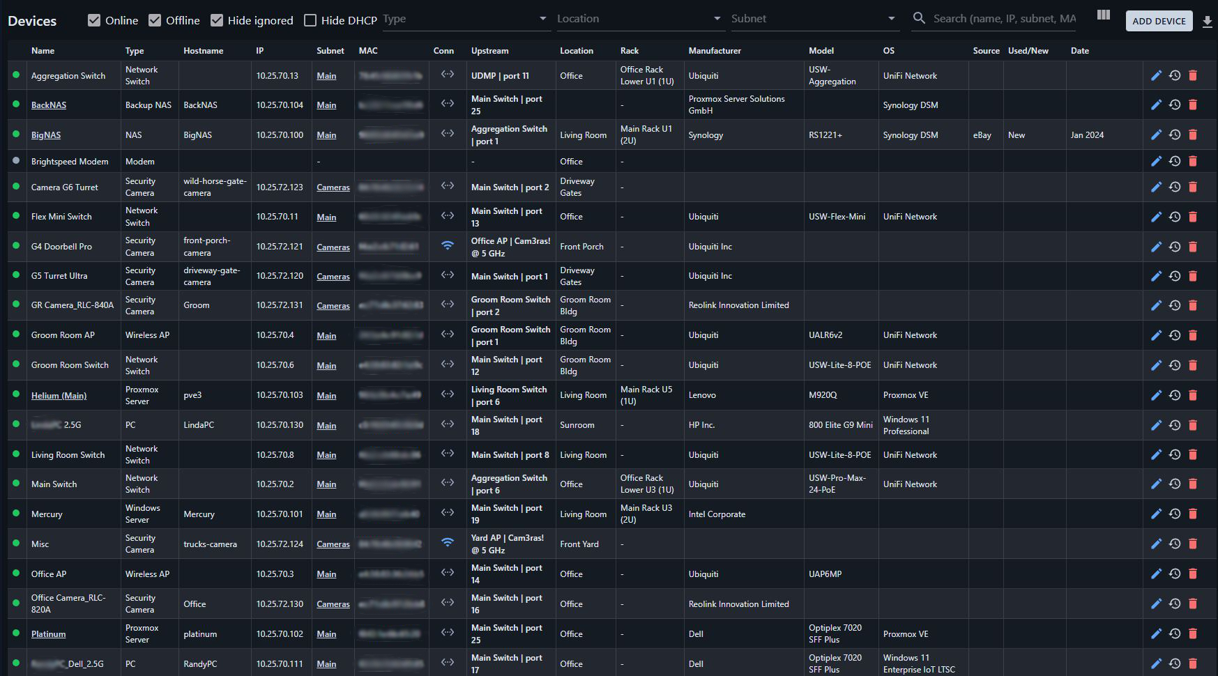 Network devices imported from UniFI anotmatically get assigned proper predefined types such as Gateway/Router, Network Switch, and Access Point. Client types help give more clarity to what is on the network. Combined with other critical data such as location and rack, if an issue arises, you know what it is and where it is.