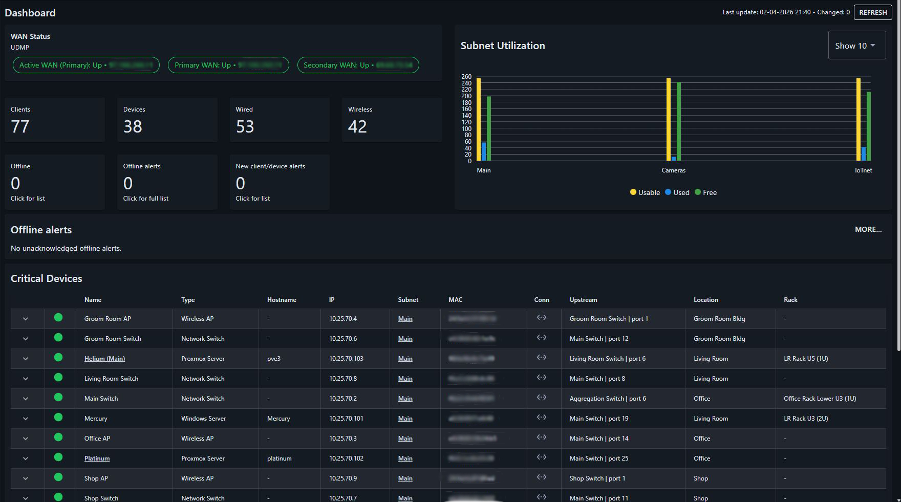 Import data directly from your UniFi gateway. Netipam utilizes a local view-only user so access to UniFi is controlled and safe. Netipam then checks for client and device changes on a defined interval to keep the data up to date. This allows offline alerts and new device alerts on the dashboard.