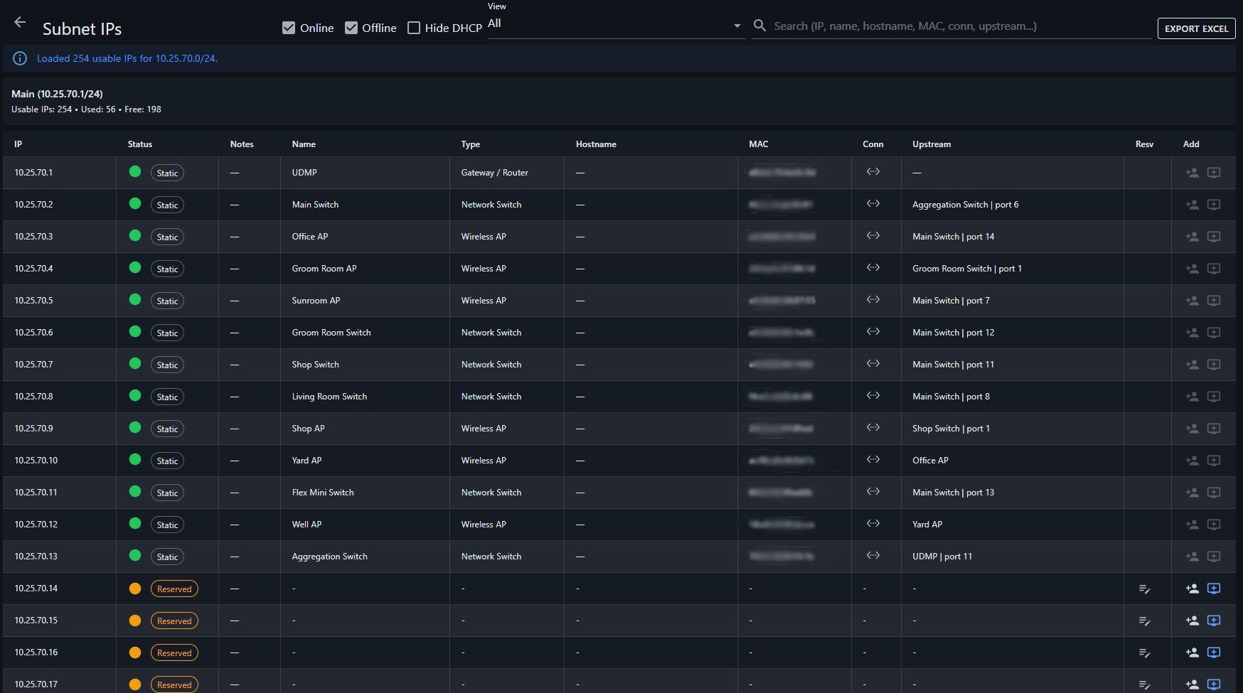 Each subnet can then be viewed in detail with the full IP address list, showing what client/device is utilizing each IP, or if the IP is reserved, DHCP or free for use. Each client/device also displays it's current online status.