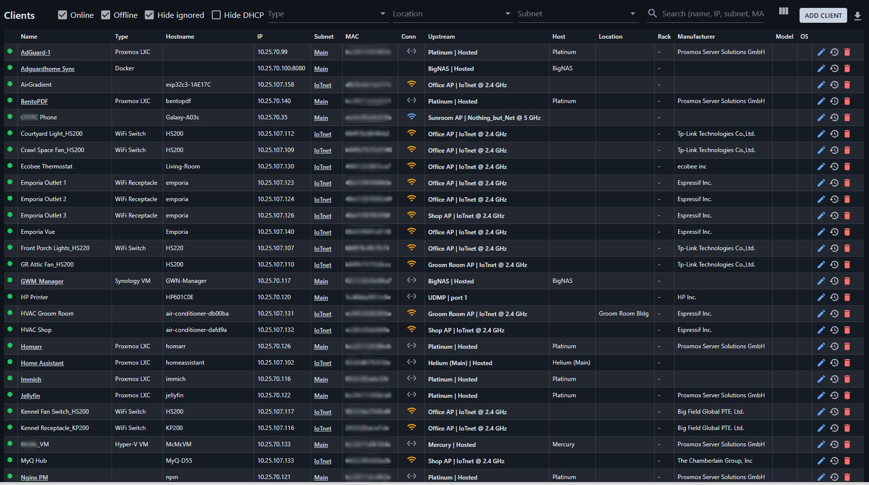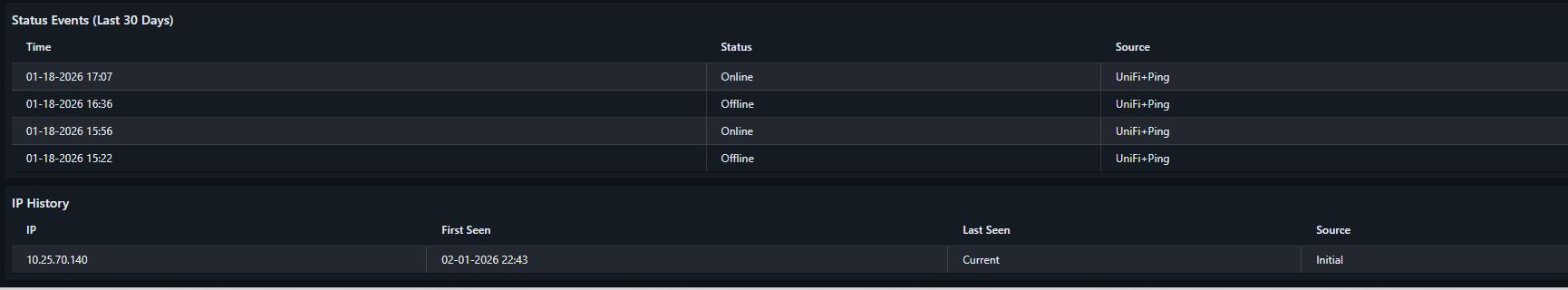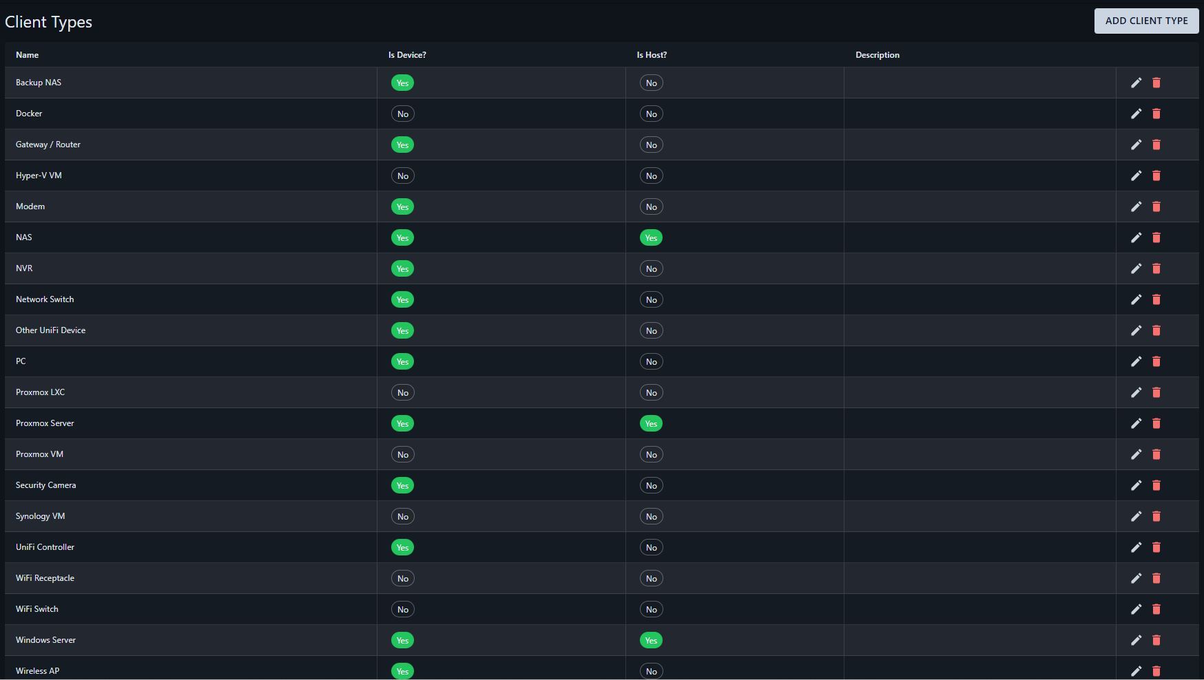 Much the way UniFi differentiates clients from devices, Netipam imports everything that is not a UniFi device from UniFi as clients and gives the user the option to set "client types", which can be set as devices to give addition or unique tracking data. Devices such as servers, computers, switches and more can be segregated with additional tracking data, such as asset # and acquisition data.