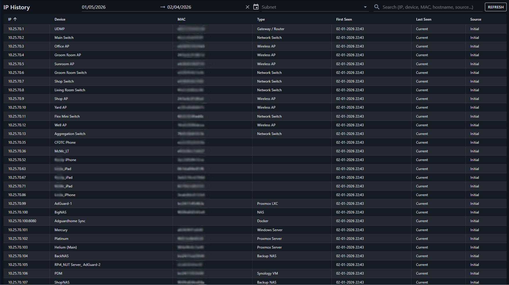 At this time, Netipam is UniFi centric. Netipam pulls client and device information from the UniFi controller (either the gateway or UniFi OS) and uses that information to build an IPAM, Network Topology, device and client connection details and status, and more. In a future release, we will be also adding UniFi Protect integration and some Proxmox integration as well. Below is an overview of the many features within Netipam.