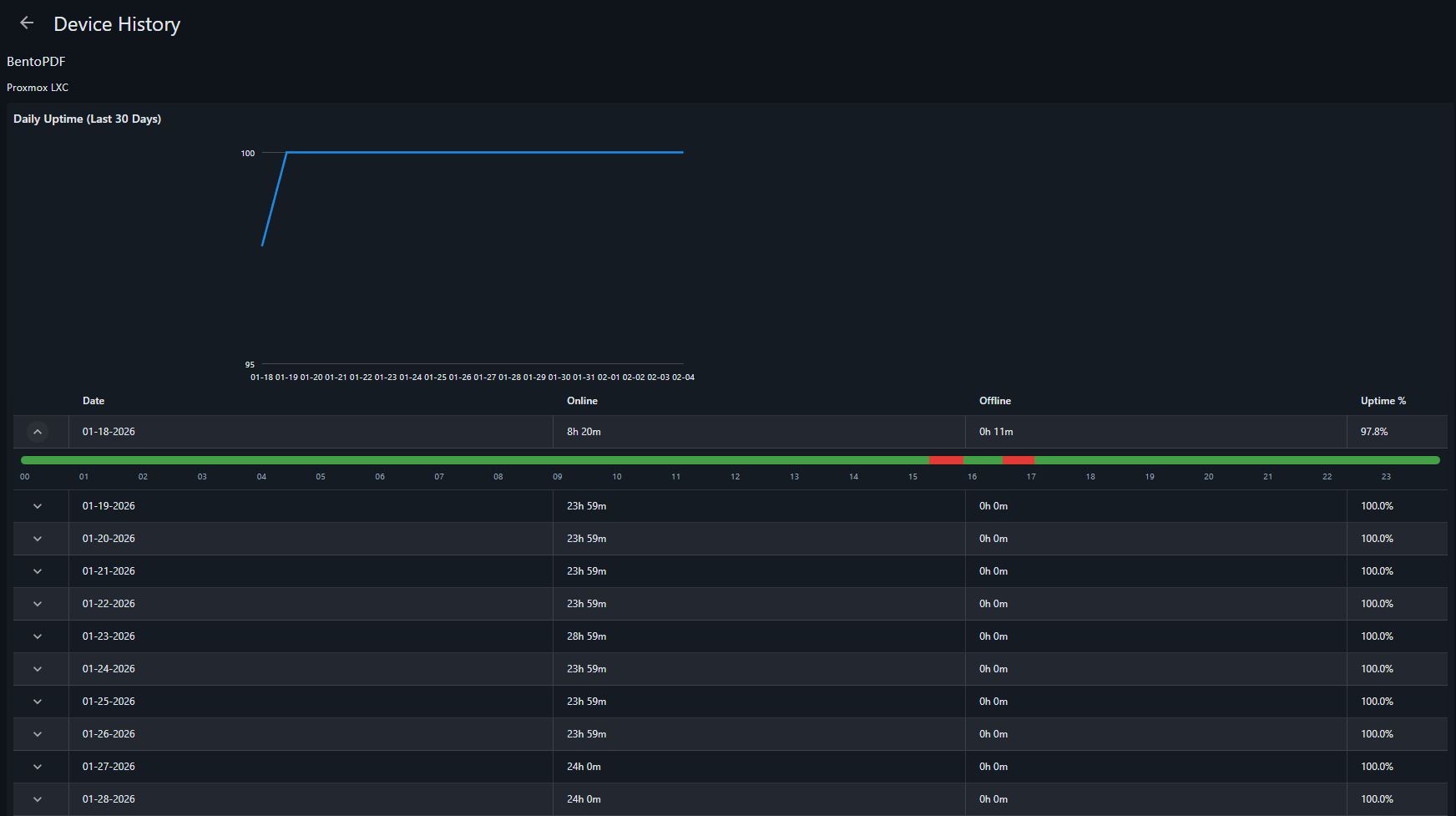 The history option shows the online/offline history of each device, with a 30 day chart and timeline for each 24 hour period from the past 30 days. There is also a list of status events from the past 30 days detailing when the device went online and offline. The history view also gives an IP history for a device showing what IPs the device has utilized.