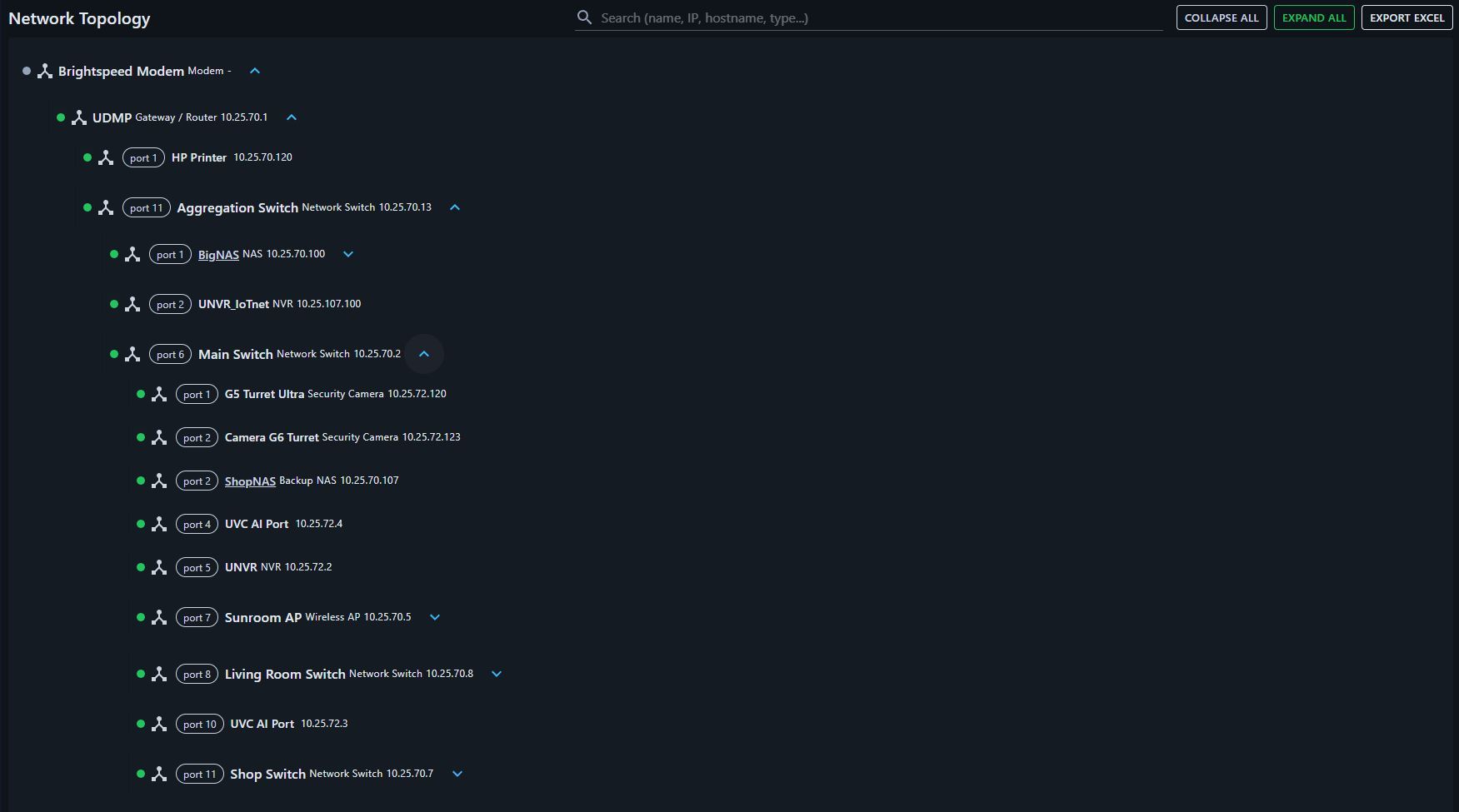 The Network Topology Page give a hierarchy of your network setup, allowing you drill down into your network layer by layer. By default, Netipam uses your Gateway/Router as the parent device but you do have manual control for situations where you may have a modem that is not directly part of the UniFi network (it can be manually added as a parent device) or if you ahve more than one gateway/router.
