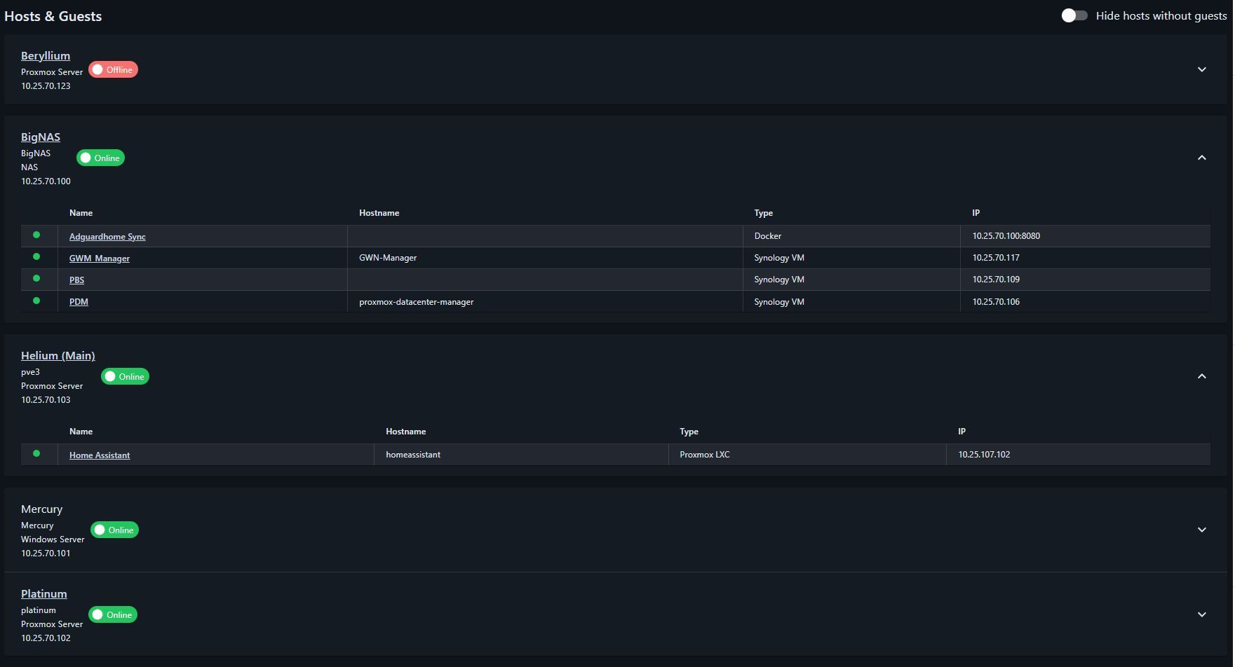 The Host and Guest pages displays a list of devices that are set as a host and their guest clients. The online status of the hosts and guests is also shown, along with the following information for each guest client: