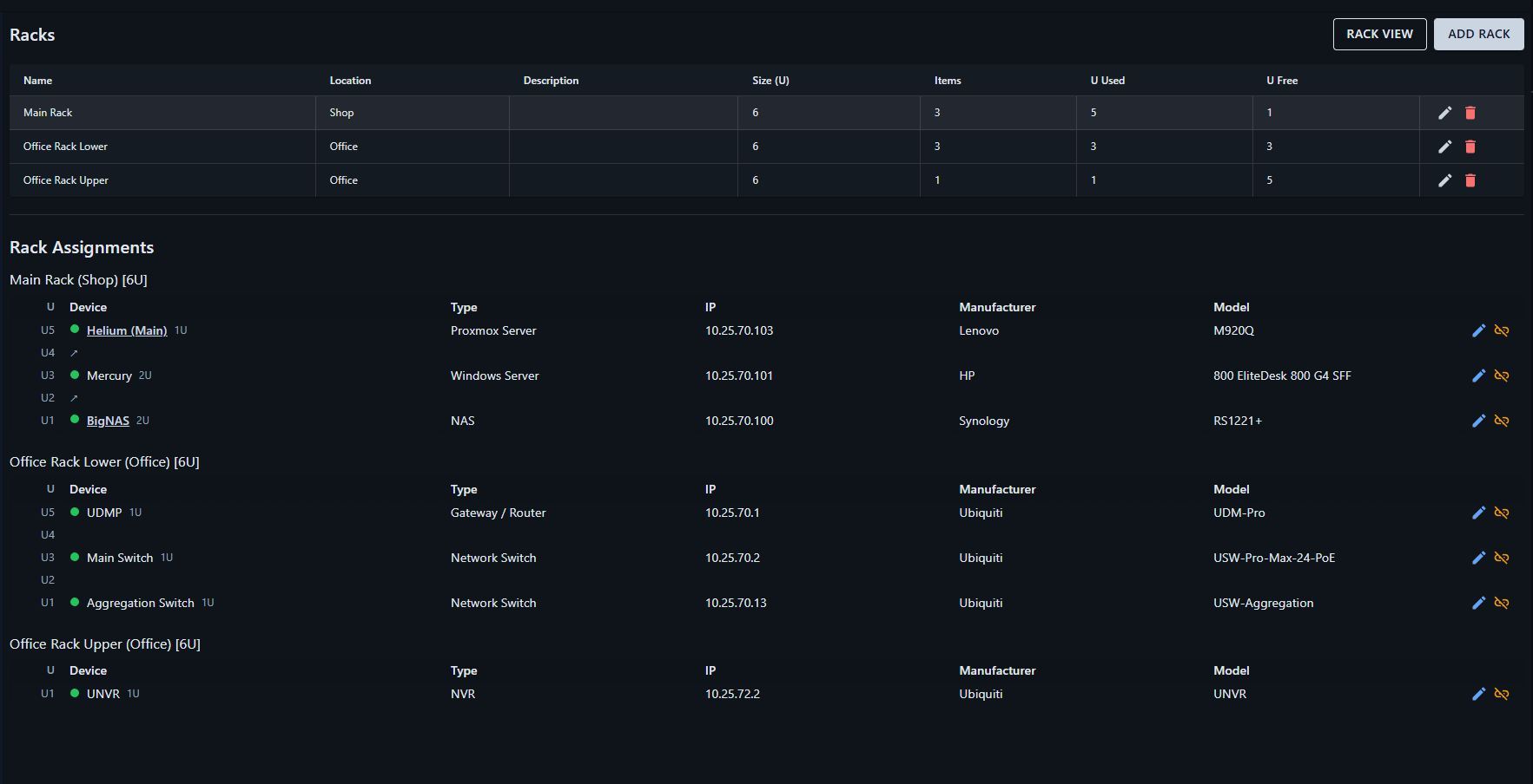 Clients and devices can be assigned to a rack. Racks are defined by the user, and details down to position and size are able to be defined for every client device in in a rack. The Rack page also gives a visualization of each rack.