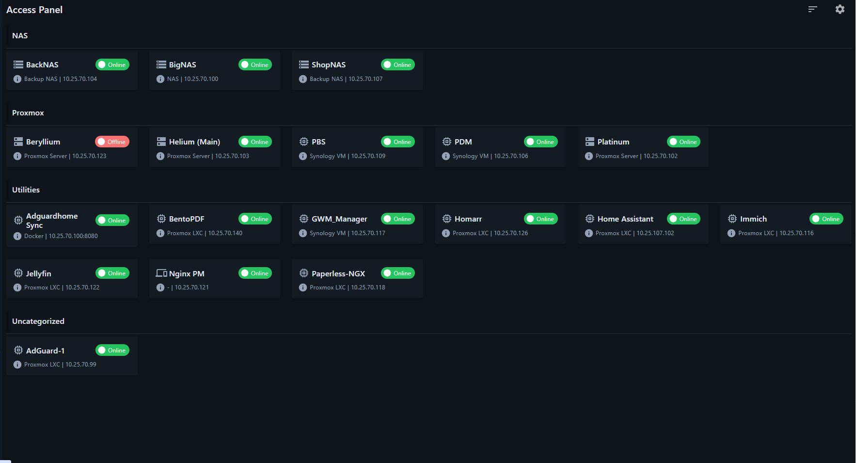 Tiled access panel to allow easy access to clients and devices. Each client/device can have an access link (URL) set. If a a client/device has an access link set, it will show on the access panel page. The access panel page is customizable and can be arranged by access categories.